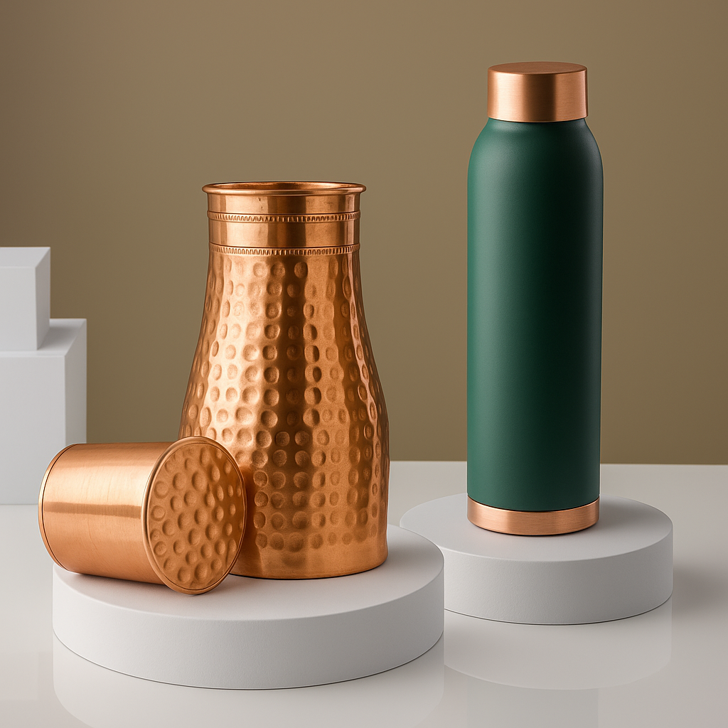 Bring home a perfect blend of traditional elegance and modern design with this exclusive Copper & Matte Bottle Combo by VSH Enterprises. This set features a beautifully hammered pure copper jug and a sleek matte-finish copper bottle, combining timeless craftsmanship with contemporary style.